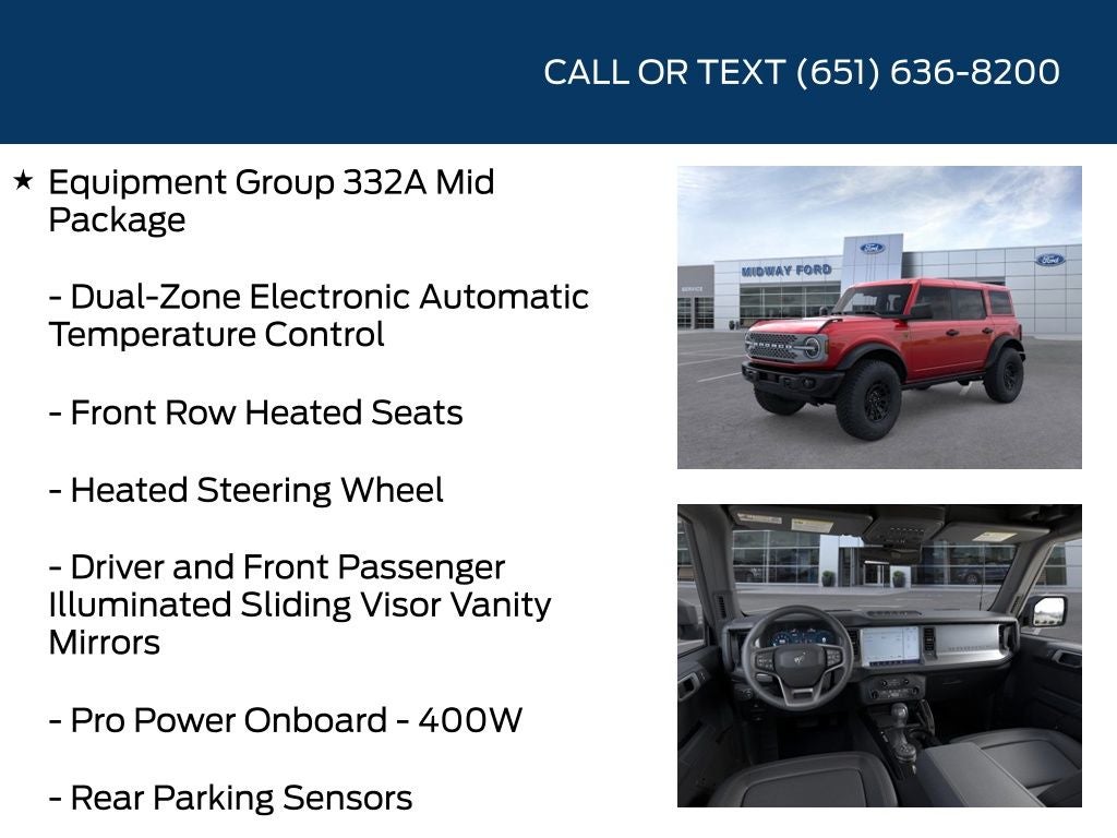 Apple CarPlay, Android Auto, Equipment Group 332A Mid Package, Ford Connectivity Package (1-Year Included), Front Row Heated Seats, Heated front seats, Marine Grade Vinyl Heated Bucket Seats, Rear-View Camera, Remote Start System, Sasquatch Package, Security system, Trailer Tow Package.